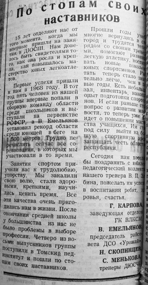 Фотография из Муниципального архива администрации Асиновского района. В спортивной школе был оборудован большой зал с баскетбольными щитами. Второй, верхний зал, был поменьше. В него можно было попасть через нижний зал, поднявшись по ступенькам. Потолок в верхнем зале был низким, но здесь была оборудована яма для прыжков в длину и лежала резиновая дорожка. Во время удачного прыжка казалось, что можно зацепить потолок головой. В верхнем зале стояли также гимнастические брусья, на которых оттачивали свое мастерство прыгуны в высоту. Тогда еще прыгали перекидным. На стиль фосбери-флоп юные прыгуны перейдут после того, как появятся поролоновые маты. Поролон нарезали полосами и клеили их крестообразно, чтобы образовался толстый мат. Вместе с поролоновыми матами появился и новые виды спорта - прыжок с шестом и десятиборье. Для прыжков маты укладывались в дальнем конце большого зала. Из входного коридора, если идти прямо, можно было попасть в учительскую и кабинет директора, налево были раздевалки, а сразу после входа направо - склад. Здесь каждый учащийся получал кеды, теплый костюм для тренеровок на улице, кроссовки для участия в соревнованиях. На складе было много других полезных вещей - утяжелители для ног, различная резина для бега с сопротивлением, мячи, в том числе тяжелые набивные для бросков, блины для штанги, стартовые колодки и снаряды для метания - ядра, диски, копья... И, конечно, завхоз имел под рукой принадлежности для субботников, включая краску, кисти, лопаты, мётлы... Беговые тренировки проводились на улице. В летнее время бегуны бегали кроссы по лесу, в сторону Хромковой горы, зимой - по трассе в сторону Новиковки, мимо охраняемой зоны. Часто мимо проезжали закрытые машины с заключенными. Бегать здесь было не безопасно. Однажды пьяный водитель зацепил бортом цистерны группу ребят. К счастью, все обошлось благополучно. Тревожная заметка по этому поводу была опубликована в газете "Причулымская правда" за 24.12.1974 г. от имени родителей. Скоростную работу летом проводили в горсаду, зимой - на улице Ивана Бунина - машин здесь почти не было. Во время весенней распутицы бегали на насыпи железной дороги, где земля просыхала немного раньше.