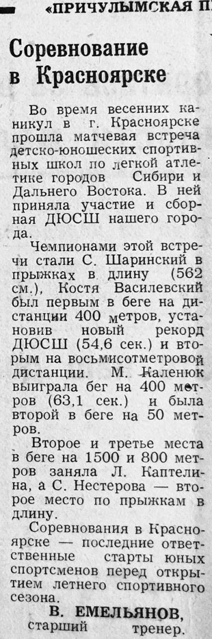 Во время школьных каникул, в начале января в Барабинске состоялась матчевая встреча ДЮСШ городов Сибири. Победу в прыжках в длину одержал С. Шаринский (575 см). Он также был вторым в прыжках в высоту. Призерами стали также М. Белоглазова (высота 130 см), А. Тарасенко (600 м), Т. Щеголева (600 м), И. Сереброва (300 м). Источник: газета Причулымская правда за 26.01.1982 г. Автор В. Емельянов. В Новокузнецке состоялась всесоюзная матчевая встреча на кубок олимпийского чемпиона В. Борзова. Второй результат в беге на 1000 метров показала Л. Каптелина (3.19,4). Успешно выступили И. Макаренко, С. Шаринский. Источник: газета Причулымская правда за 26.01.1982 г. Автор В. Емельянов. В Туле честь областного совета ДСО "Урожай" защищали С. Васильева (100 м - 12,8 сек), М. Медюхина (60 м - 8,1 сек), С. Подобин (800 м - 2.04,7). Источник: газета Причулымская правда за 26.01.1982 г. Автор А. Сарычев. В Рязани прошло первенство РСФСР по бегу среди ребят 1965-66 г.р. М. Каленюк в составе сборной команды области удачно пробежала 200 м. Источник: газета Причулымская правда за 26.01.1982 г. Автор А. Васильева. В начале февраля в Новосибирске состоялась матчевая встреча ДЮСШ Сибири и Дальнего Востока. Л. Каптелина в сумме двоеборья стала чемпиокой (300 м - 46,2, 1000 м - 3.09,7). Призерами стали: О. Ермакович, С. Мельник, В. Туров, О. Каратаев, К. Василевский, С. Подобин, И. Мишечкина, М. Каленюк. Источник: газета Причулымская правда за 10.02.1982 г. Автор Н. Скопинцев. В марте в Калининграде прошло зимнее первенство ЦС ДСО "Урожай". В сборной команде облсовета выступали наши спортсмены: Слава Мельник (4 место на 200 м), Костя Василевский (второй на 800 м). Источник: газета Причулымская правда за 16.03.1982 г. Автор В. Емельянов. В марте в Асино прошла традиционная матчевая встреча ДЮСШ Томской области. На этот раз наша команда стала второй. Хорошо выступили: В. Русинов, М. Белоглазова, И. Мишечкина, С. Шаринский, О. Денисова, Л. Каптелина, А. Тарасенко, В. Горощенко. Источник: газета Причулымская правда за 16.03.1982 г. Автор В. Емельянов. Во время весенних каникул в Красноярске прошла матчевая встреча ДЮСШ городов Сибири и Дальнего Востока. Чемпионами стали: С. Шаринский (длина - 562 см), К. Василевский (400 м - 54,6 - новый рекорд ДЮСШ), М. Каленюк (400 м - 63,1). Призерами стали Л. Каптелина, С. Нестерова. Источник: газета Причулымская правда за 9.04.1982 г. Автор В. Емельянов. 29-30 мая в рабочем поселке Любино, в 60 км от Томска, прошел чемпионат Сибири и Дальнего Востока среди сельских спортсменов. Тренер ДЮСШ Анатолий Сарычев стал чемпионом Сибири в беге на 1500 метров, а на 5-км дистанции занял третье место. Хорошо выступили С. Васильева, Г. Москалева, М. Каленюк. Источник: газета Причулымская правда за 9.06.1982 г. Автор В. Емельянов. В Белгороде прошло первенство ЦС ДСО "Урожай" среди ребят среднего возраста. Среди призеров наш Андрей Тарасенко (1500 м). Лариса Каптелина была четвертой. Источник: газета Причулымская правда за 9.07.1982 г. Автор Н. Скопинцев. В Томске прошли областные соревнования по многоборью ГТО среди школьников. Победителями стали Таня Головчанская и Света Нестерова. Источник: газета Причулымская правда за 9.07.1982 г. Автор Н. Скопинцев. В Томске прошло первенство области среди школьников. С общекомандной победой вернулись: Слава Мельник (100 и 200 м), Таня Головчанская (400 м), Лариса Каптелина (800 и 1500 м), Саша Шаблеев (800 м). Источник: газета Причулымская правда за 10.07.1982 г. Автор Н. Скопинцев. В начале июля в