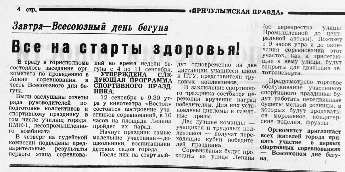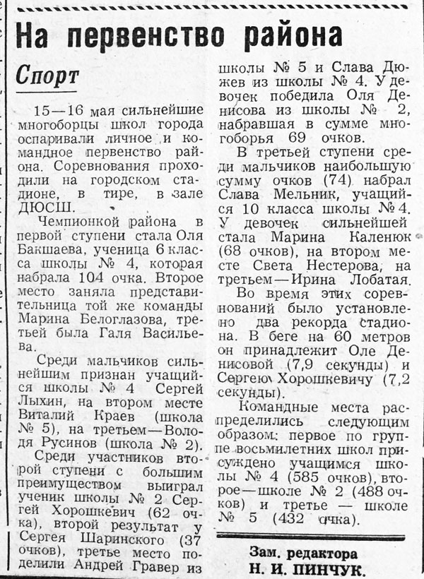 3 сентября в пионерском лагере "Орленок" открылись финальные соревнования Всесоюзного слета "Старты надежд". В них приняли участие ученики спортивного класса асиновской школы №4. Источник: газета Причулымская правда за 3.11.1982 г. Автор А. Николаенко, ученица школы №4. В дни осенних каникул в Томске состоялась матчевая встреча, посвященная 30-летию образования Томской ДЮСШ. Нашу школу представляли 24 спортсмена. Отличились К. Василевский, М. Белоглазова, С. Филатов. Источник: газета "Причулымская правда" за 17.11.1982 г. Автор Н. Скопинцев. В декабре в Новокузнецке прошла матчевая встреча ДЮСШ городов СССР. В ней участвовали 5 асиновцев. Саша Семушкин был вторым на 60 м, Лариса Каптелина выиграла 1000 м. Источник: газета "Причулымская правда" за 16.01.1983 г. В декабре в Томске прошла матчевая встреча ДЮСШ области. В ней участвовали 20 асиновцев - ребят 1969-70 и 1971-72 г.р. Лучше всех выступила Галя Васильева, занявшая 3-е место в многоборье. Источник: газета "Причулымская правда" за 16.01.1983 г. Обзорная статья по участию асиновских спортсменов в зимних и весенних соревнованиях 1982 года. Источник: газета "Причулымская правда" за 15.05.1982 г. Автор А. Васильева. Еще одна статья по результатам участия асиновских спортсменов в сезоне 1982 года. Приведено фото Вячеслава Мельника. Источник: газета "Причулымская правда" за 14.08.1982 г. Автор В. Минаева. ВВЕРХ