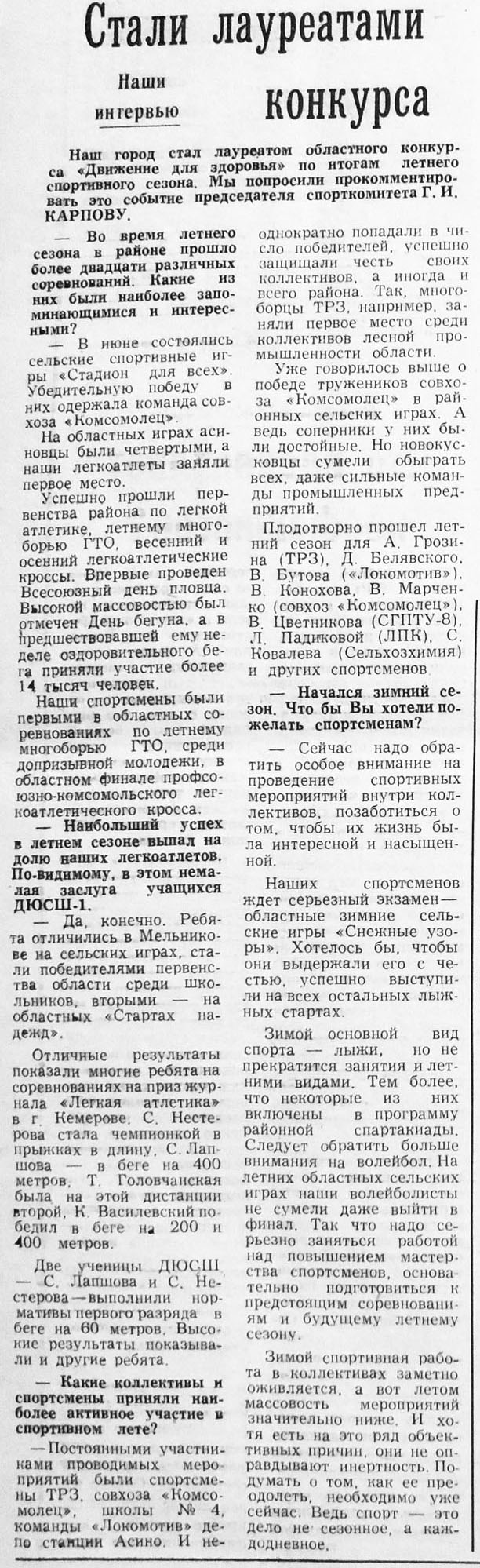 К дню физкультурника опубликована статья о результатах выступления асиновских легкоатлетов в сезоне 1983 года. Кроме перечисленных ниже стартов упоминаются: первенство ЦС ДСО "Урожай" в городе Кропоткине (Василевский третье место на 400 м с/б), матчевая встреча в Новосибирске (Каптелина первая на 1000 м). Три человека выполнили норматив первого спортивного разряда. Газета "Причулымская правда" за 13.08.1983 г. Автор Н. Скопинцев. В марте в Красноярске прошла матчевая встреча городов СССР. Были представлены 10 команд, в том числе 12 спортсменов из Асина. Чемпионом сразу в двух видах - на 300 м и 300 м с барьерами стал Константин Василевский. Всего двух десятых не хватило ему до норматива первого разряда. Чемпионкой стала и Светлана Нестерова в прыжках в длину. Призерами стали Лариса Каптелина, Андрей Тарасенко, Светлана Лапшова, Сергей Шаринский, Татьяна Головчанская, Саша Семушкин. Неплохо выступили Олег Каратаев, Андрей Чернобай, Валерий Туров, Лена Булиенко, Андрей Рудаков. Источник: газета "Причулымская правда" за 30.03.1983 г. Автор В. Петров. В апреле в городе Гулькевиче Краснодарского края прошел кросс ЦС ДСО "Урожай" РСФСР. Участвовали четыре спортсмена из Асина в составе сборной команды Томской области: Лариса Каптелина (второе место на 1000 м), Андрей Тарасенко, Олег Каратаев, Саша Фадеев. Источник: газета "Причулымская правда" за 29.04.1983 г. Автор А. Сарычев. 21-22 мая в Томске прошли соревнования с целью отбора на спартакиаду школьников, которая пройдет в июле в Новосибирске. Участвовали 20 асиновских спортсменов. Рекорд района и ДЮСШ по прыжкам в длину превысили С. Нестерова - 5,50. Костя Василевский также превысил рекорд района в беге на 400 м - 51,6. Первой на дистанции 800 и 1500 м была Л. Каптелина. Андрей Тарасенко выиграл 3000 м и стал вторым на 1500 м. В сборную области вошли также С. Лапшова, А. Семушкин, О. Каратаев. Источник: газета "Причулымская правда" за 3.06.1983 г. Автор А. Васильева. Параллельно с отборочными в Томске прошли соревнования на приз журнала "Легкая атлетика". Учащиеся школы №4 выиграли как по средним, так и по восьмилетним школам. Чемпионами стали: С. Нестерова, Е. Булиенко, К. Василевский, О. Ермакович, А. Тарасенко, Л. Каптелина. Удачно выступили также: И. Сереброва, Г. Васильева, О. Бокшаева, М. Белоглазова, А. Рудаков, А. Чернобай. Источник: газета "Причулымская правда" за 3.06.1983 г. Автор А. Васильева. В Кемерове прошел следующий этап соревнований на приз журнала "Легкая атлетика". С. Нестерова стала чемпионкой по прыжкам в длину, С. Лапшова - в беге на 400 м, Т. Головчанская была второй на этой дистанции. К. Василевский победил в беге на 200 и 400 м. Источник: газета "Причулымская правда" за 26.11.1983 г. 17-19 июня 1983 года в селе Мельниково Шегарского района прошли первые областные летние сельские спортивные игры "Стадион для всех". В программе 8 видов спорта: легкая атлетика, футбол, волейбол, гиревой спорт, велоспорт, городки, настольный теннис, комбинированная эстафета. Честь асиновского района защищали около 60 человек. 40 из них участвовали в финальных соревнованиях. Отлично выступила Ольга Денисова, выигравшая бег на 100 м, прыжки в длину и первое место в составе эстафетной команды 4 х 100 м. Чемпионами игр стали: А. Сарычев (1500 и 3000 м), А. Тарасенко (800 м). Призовые места заняли: С. Лапшова, Г. Васильева, В. Юранов, Л. Булиенко. В комбинированной эстефете из 12 этапов с большим отрывом на п