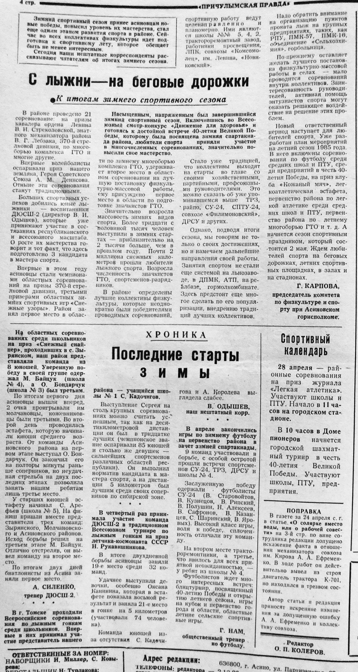 16-17 марта 1985 г. в Асине состоялись областные соревнования по многоборью ГТО среди работников просвещения. Асиновцы заняли первое командное место. На втором месте - Шегарский район, на третьем - Зырянский. Чемпионами стали: Михаил Байцук (учащийся школы №4), Андрей Вишняков (тренер ДЮСШ-2), Светлана Воробьева (учащаяя школы №2), Марина Медюхина (тренер ДЮСШ-1). Второе мето занял Александр Силенко (ДЮСШ-2), третьим призером стал преподаватель школы №2 Г. Т. Рябов. Источник: газета "Причулымская правда" за 22.03.1985 г. 8-9 мая 1985 г. в Асине состоялись областные соревнования на приз журнала "Легкая атлетика". Асиновская команда - школа №4 - заняла первое командное место по средним школам. По восьмилетним школам первыми были кожевниковцы. На стометровке чемпионами стали наши спортсмены: Валерий Вакарь, Ольга Пискунова, Александр Семушкин. На 400-метровке - Ирина Кускова, Татьяна Головчанская. Полтора километра в своих возрастных группах быстрее всех пробежали Галина Фадеева, Лариса Каптелина, Андрей Лукин. Источник: газета "Причулымская правда" за 15.05.1985 г. Автор Н. Оськин. 24-26 мая 1985 г. в Кемерово состоялось первенство зоны Сибири и Дальнего Востока. Протоколы не найдены. 13-14 июля 1985 г. в Бакчаре прошли третьи областные летние спортивные игры "Стадион для всех". Всего в асиновской команде было 19 человек, в том числе 10 легкоатлетов. По три раза поднимались на высшую ступеньку пьедестала выпускница школы №4 Лариса Каптелина (800 м - 2.22,0; 1500 м - 5.05,1) и учащаяся 9 класса школы №2 Елена Кривошеина (200 м - 27,4; 400 м - 1.03,7), по два раза - выпускник школы №1 Александр Семушкин (200 м - 24,0) и тренер ДЮСШ Татьяна Костень (высота - 155 см). Светлана Лапшова заняла второе место по прыжкам в длину (475 см) и третье в беге на 100 м - 13,6; Александр Семушкин - второе место на 100 м - 11,3; Сергей Гончаров - третье место по прыжкам в высоту - 165 см; Александр Янц - третье место в метании копья - 46,32. Выиграв женскую и мужскую эстафеты 4х100 м (53,4 и 48,5 сек), легкоатлеты асиновского района заняли первое место. В эстафете участвовали: Елена Кривошеина, Лариса Каптелина, Татьяна Костень, Светлана Лапшова, у мужчин - Валерий Манахов, Сергей Гончаров, Александр Семушкин, Валерий Вакарь. Несмотря на отличное выступление легкоатлетов, в общем зачете асиновцы остались на четвертом месте. Первое общекомандное место присуждено Томскому району, второе - Колпашевскому району, третье - Кожевниковскому. Источник: газета "Причулымская правда" за 12.07.1985 г. и 19.07.1985 г.
