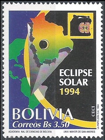 Марка Республики Сальвадор, расположенной на перешейке между Америками. Затмение 11 июля 1991 года. Справа: В столице Боливии Сукре затмение 3 ноября 1994 года наблюдалось как частное с фазой 0,99. Полоса затмения изображена неверно. Она проходила с запада на восток. |